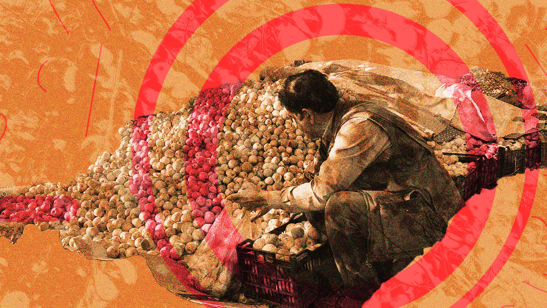مئات من أكوام هذا المحصول تنتشر وسط بساتين في قرية خيزافا على الشريط الحدودي بين العراق وتركيا، حيث يعيش كولي ويزرع.